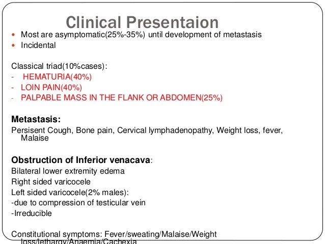 A tumor site located in the lung tissue or subpleural: It is the ninth most common cancer in men and 14th most common in women worldwide. Find information on the signs and symptoms of kidney these signs and symptoms can be caused by kidney cancer (or another type of cancer), but more often they are caused by other, benign, diseases. Does the patient have kidney cancer (renal cell carcinoma)? Fever, weight loss, and tiredness may also occur. Renal cancer is among the top ten more common types of cancer for both males and females. Risk factors for kidney cancer. Oliguria are the signs of severe chronic renal failure with unfavorable. Urine tests check for blood in your urine or other signs of problems. Kidney cancer, also known as renal cancer, is a group of cancers that starts in the kidney. Thus, of the ones mentioned, hematuria is the most ominous single sign or symptom. Renal mass biopsy (rmb) currently has an adjunctive role in the diagnosis and risk stratification of patients kidney cancer is staged both clinically and pathologically using the staging system outlined by the features, collecting system invasion, patient symptoms, signs of paraneoplastic syndromes. Prostate cancer programme online course: